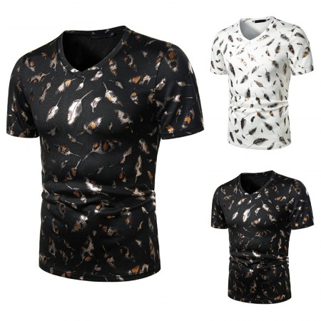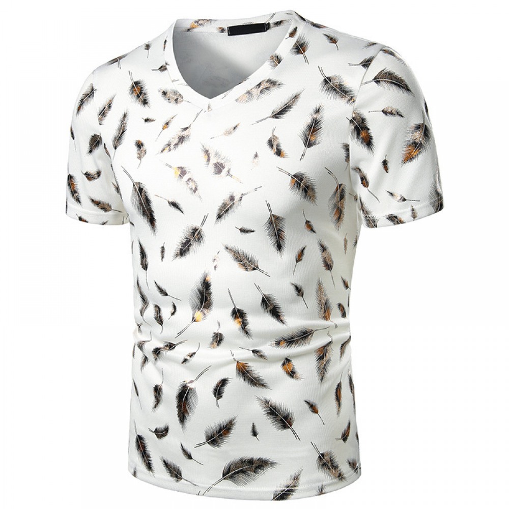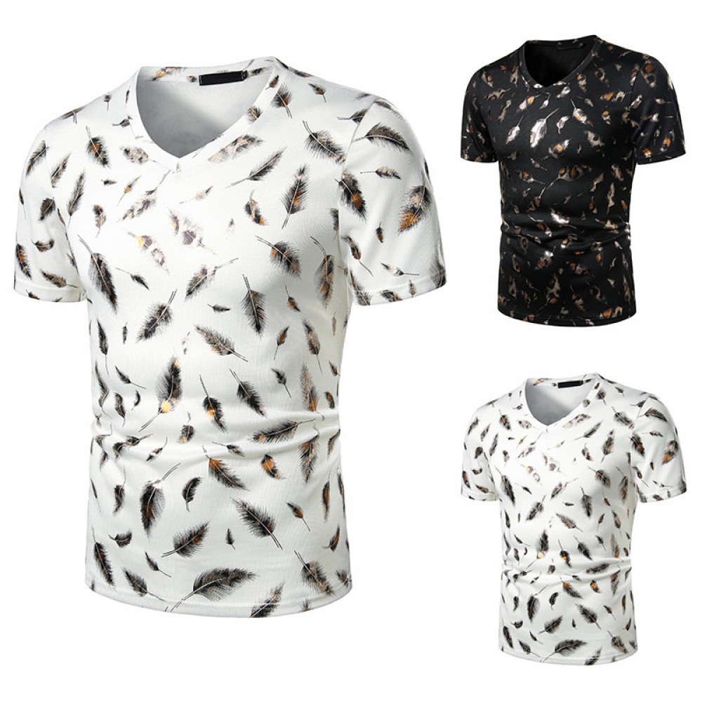 Summer Men's Nightclub Bar Fashion Casual Feather Print Short-Sleeved T-Shirt