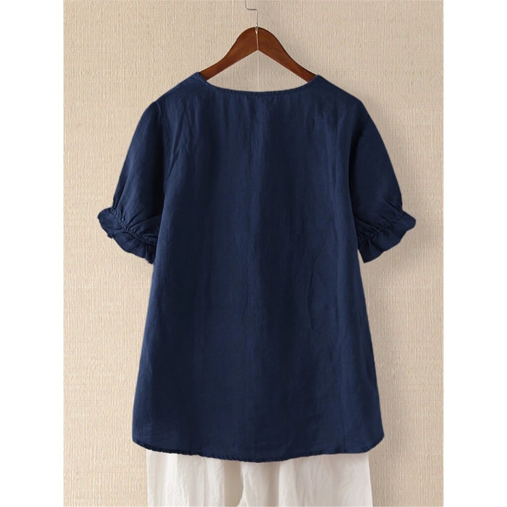 Summer Hot Embroidered Cotton Linen Short Sleeve Loose Casual Button T-Shirt Women